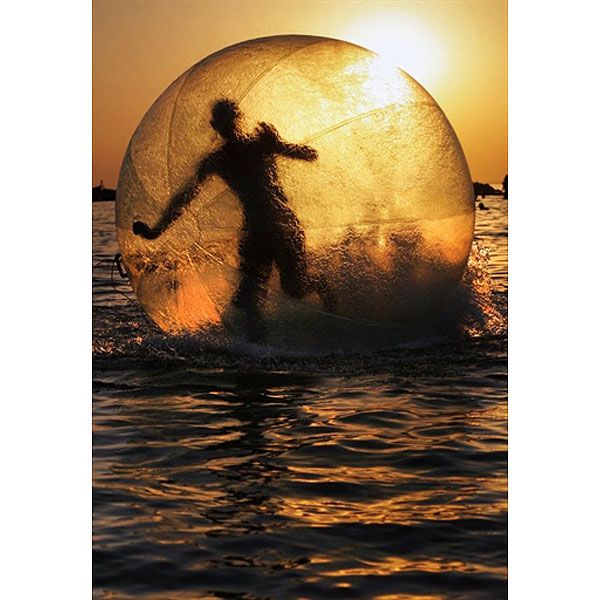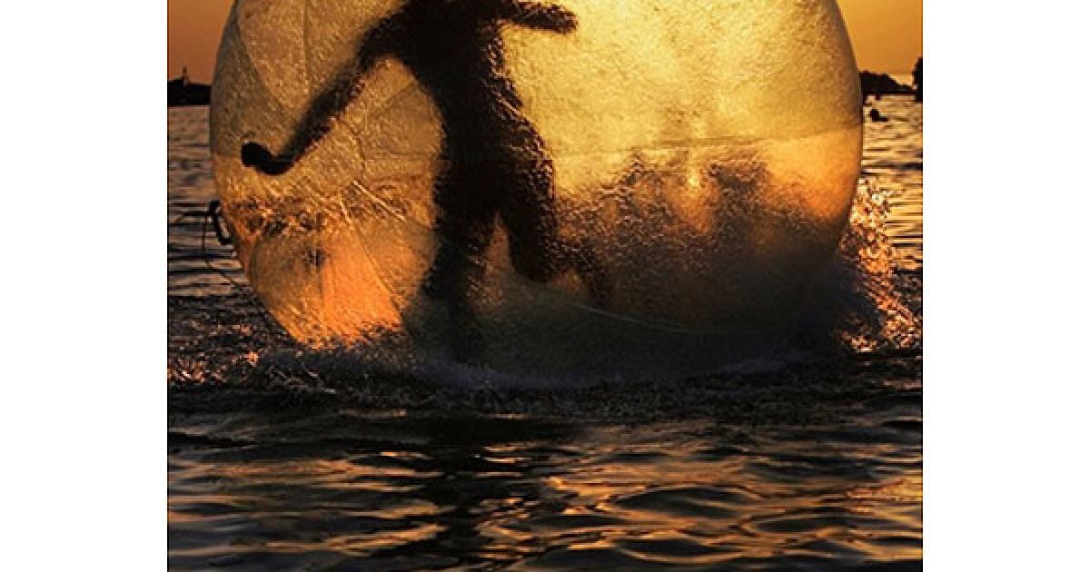 Україна, Бердянськ. Хлопець грає у гігантській надувній прозорій кулі з пластику, яка пливе Азовським морем. / © AFP