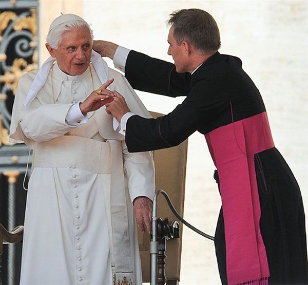 Ватикан. Папа Римський Бенедикт XVI жестикулює під час своєї відкритої аудієнції біля собору на площі Святого Петра у Ватикані, яка щотижня збирає тисячі віруючих. / © AFP