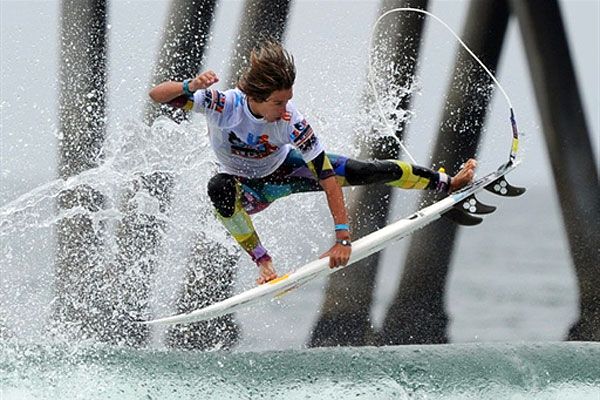 США, Хантінгтон-Біч. Американець Еван Гейзелман робить стрибок у повітря під час третього раунду змагань серед чоловіків на Відкритому чемпіонаті США з серфінгу у штаті Каліфорнія. Подія, яка збирає найкращих серферів з усього світу, цього року проходить на Хантінгтон-Біч у 51 раз. Пірс у Хантінгтон-Біч вважають батьківщиною культури серфінгу у Каліфорнії. / © AFP