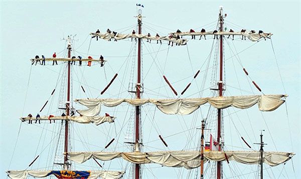 Німеччина. Чоловіки прибирають вітрила на парусному човні, який прокладає собі шлях через Балтійське море під час вітрильної регати Hanse Sail у Варнемюнде, на північному сході Німеччини. Організатори очікують, що регату відвідають до 1 млн глядачів. / © AFP