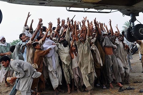 Пакистан. Пакистанці, які постраждали від руйнівної повені, намагаються зловити мішки з їжею з армійського гелікоптера, який доставив продукти до одного із затоплених селищ. Деякі мешканці затоплених селищ намагаються вибратися з району стихійного лиха і чіпляються за гелікоптер, який доставив їм продукти. Пакистан почав евакуювати населення через загрозу нових повеней, оскільки зливи не вщухають у країні протягом двох тижнів. В результаті повеней у Пакистані вже постраждали до 15 мільйонів людей. / © AFP