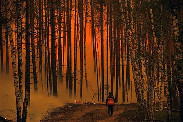 Росія, Голованово. Чоловік йде палаючим лісом неподалік від села Голованово, Рязанська область. Росія потерпає від найгірших лісових пожеж у своїй сучасній історії, в результаті яких вже загинуло 50 людей. Президент Росії Дмитро Мєдвєдєв звільнив кілька вищих військових офіцерів за халатне ставлення до катастрофи. / © AFP