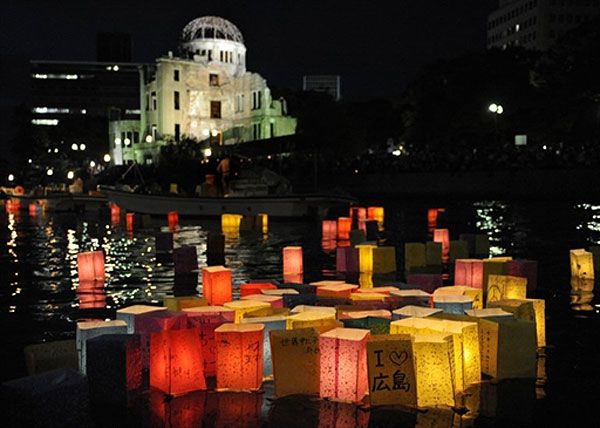 Японія, Хіросіма. Паперові ліхтарі зі свічками пливуть річкою Мотоясу поруч із будівлею Куполу атомної бомби у місті Хіросіма. Цього року виповнюється 65 років з моменту атомних бомбардувань японських міст Хіросіма і Нагасакі. У пам’ятних заходах в Японії взяли участь представники понад 70 країн, у тому числі вперше до церемонії приєднався представник Сполучених Штатів. / © AFP