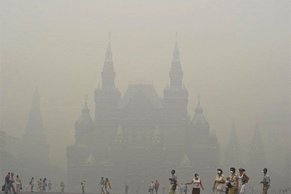 Росія, Москва. Росіяни і туристи, одягнені у захисні маски від диму лісових пожеж, гуляють Красною площею у Москві. Щільний смог від пожеж у сільській місцевості неподалік міста накрив Москву. Через високий рівень вмісту токсичних часток у повітрі, виникають занепокоєння з приводу здоров'я населення. / © AFP