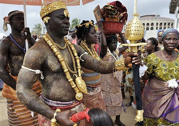 Кот-д'Івуар, Абіджан. Члени з племені Ebrier беруть участь у етнічному парад племен, який провели у Абіджані в рамках святкування 50-ї річниці незалежності Кот-д'Івуара. / © AFP