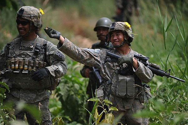Афганістан, Аргандаб. Американські солдати сміються і чіпляють один одному на шоломи жовті квіти під час спільного патрулювання американських військових і національних сил безпеки Афганістану у долині Аргандаб, провінція Кандагар. У світі зростає невдоволення діями американців під час війни у Афганістані. Президент США Барак Обама став на захист американських військових, заявивши що певний прогрес був досягнутий у питанні забезпечення безпеки у країні. / © AFP