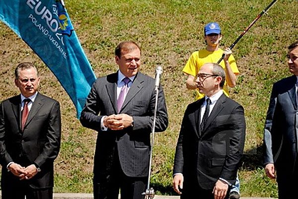 В урочистій церемонії відкриття логотипу у Харкові взяли участь Генеральний консул Польщі у Харкові Гжегож Серочинський, віце-прем’єр-міністр з питань Євро-2012 Борис Колесніков, голова Харківської ОДА Михайло Добкін, секретар Харківської міськради Геннадій Кернес тощо. / © mediaport.info