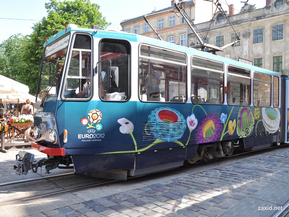 У Львові розпочав курсувати трамвай Євро-2012. Дизайн трамваю розробляла дизайнерська група УЄФА, оформлення виконано у кольорах турніру, а увесь корпус прикрашено символікою чемпіонату. / © ZAXID.NET