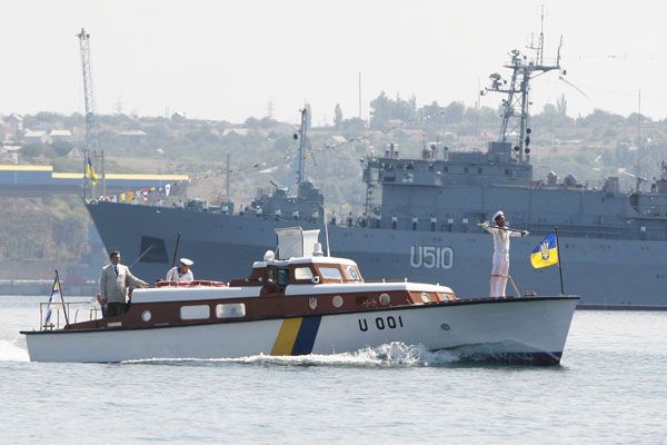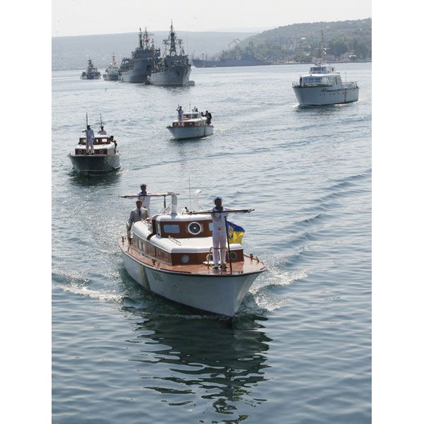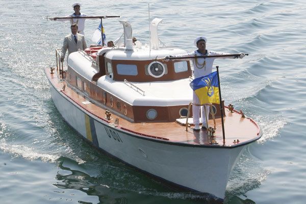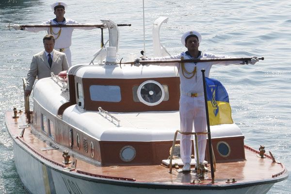На катері Віктор Янукович оглянув стрій кораблів ВМС України, морської охорони Державної прикордонної служби України та корабель ЧФ РФ (вишикуваних на внутрішньому рейді Севастопольської бухти). / © President.gov.ua