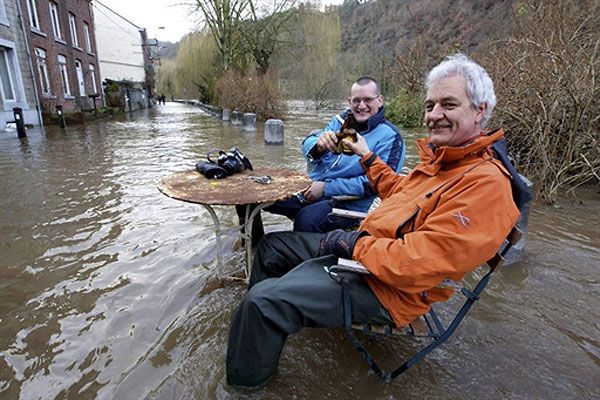 Чоловіки п’ють пиво на затопленій вулиці міста Еньо (Бельгія), поблизу річки Урт / © AFP