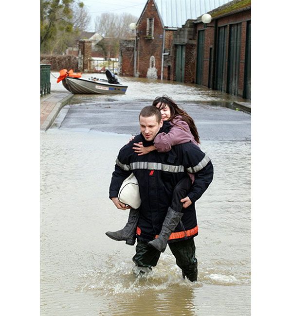 Пожежний несе дівчину під час евакуації мешканців селища Орина-Сент-Бенуа після розливу річки Уаза. / © AFP