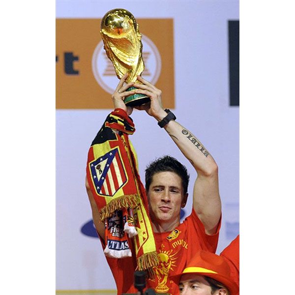 Нападаючий збірної Іспанії Фернандо Торрес тримає Кубок світу з футболу. / © AFP