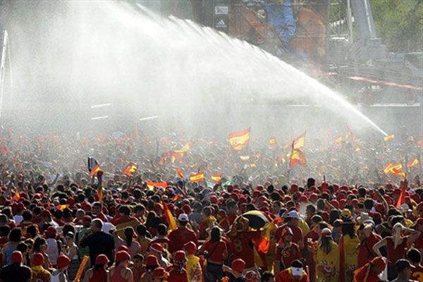 Іспанські пожежні вітали збірну Іспанії "салютом" з брандспойтів. / © AFP