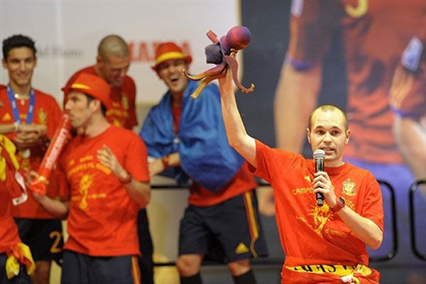 Андрес Іньєста, який забив переможний гол у фінальному матчі між Іспнаією та Нідерландами, тримає в руках іграшку - восьминіга-оракула Пауля. / © AFP