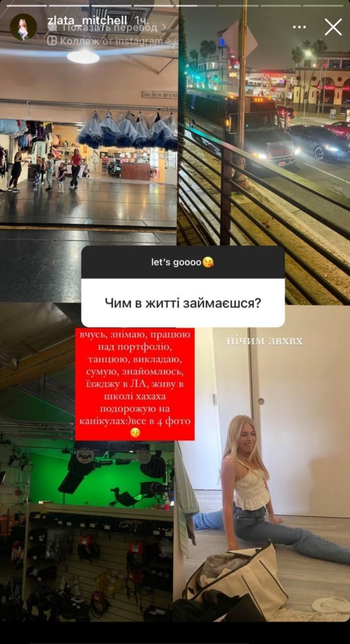 "Вчуся, знімаю, працюю над портфоліо, танцюю, викладаю, сумую, знайомлюсь, їжджу до Лос-Анджелеса, живу в школі, подорожую на канікулах", - поділилася Злата.