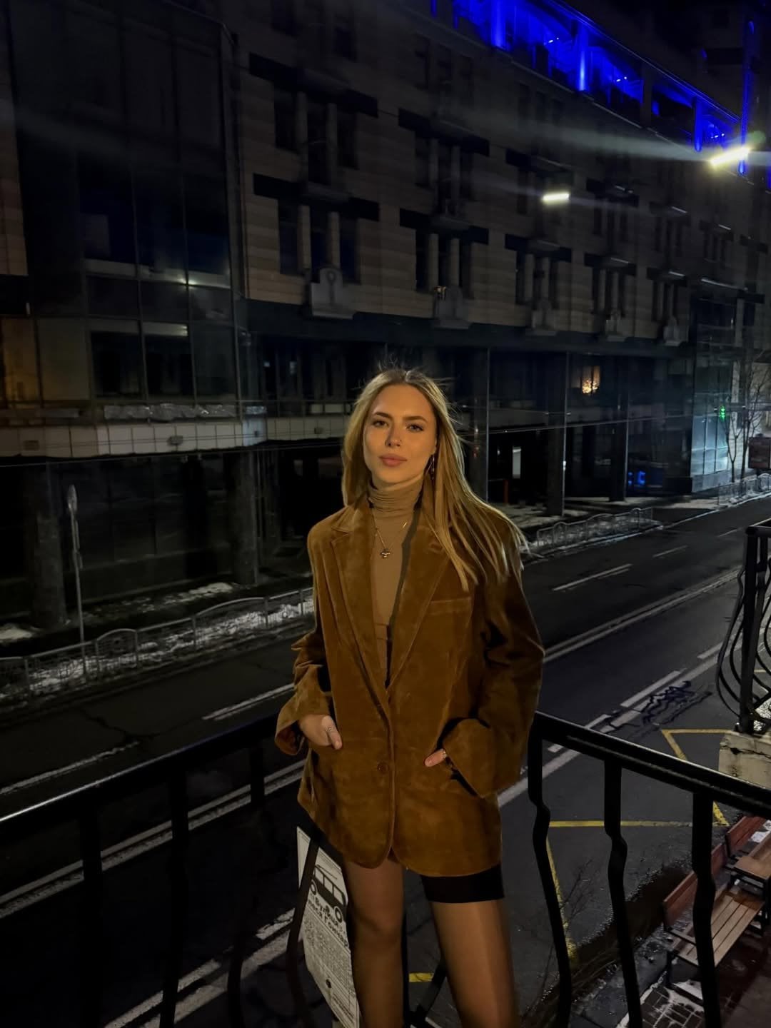 Марія постала перед об'єктивом фотокамери в гольфі, довгому жакеті та мінішортиках, що вдало підкреслили її неабияк стрункі ніжки. Образ дівчина доповнила прикрасами, а біляве волосся вона розпустила.