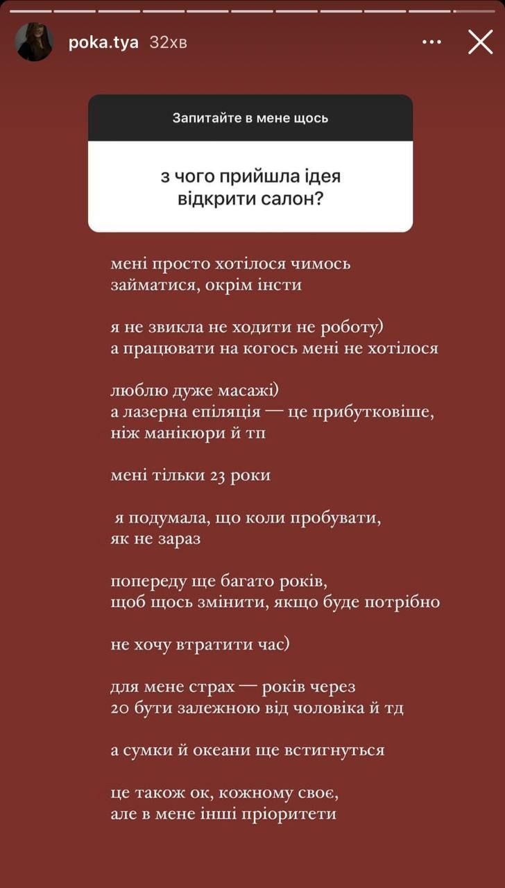 "Мені просто хотілося чимось займатися, окрім фотоблогу. Я не звикла не ходити на роботу, а працювати на когось мені не хотілося. Люблю дуже масажі, а лазерна епіляція - це прибутковіше, ніж манікюри й тому подібне. Мені лише 23 роки! Я подумала, що коли пробувати, як не зараз. Попереду ще багато років, щоб щось змінити, якщо буде потрібно. Не хочу втратити час. Для мене страх - років через 20 бути залежною від чоловіка, а сумки й океани ще встигнуться", - прокоментувала блогерка.