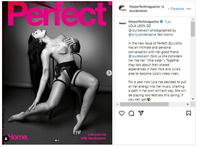 27-річна виконавиця та модель прикрасила обкладинку відомого глянцю Perfect. Для сторінок журналу Леон позувала у доволі зухвалому образі. На фото модель постала в корсеті, спідній білизні. Своє довге чорняве волосся донька Мадонни розпустила, а образ доповнила прикрасами.