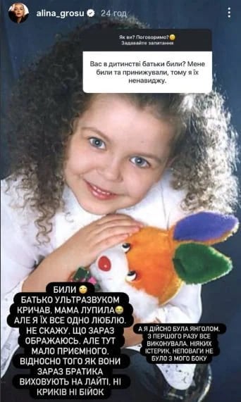 Артистка в Instagram-stories чесно зізналась, що батьки були доволі суворі. Тож, методи їхнього виховання були не найкращими. Аліна Гросу пригадує, що тато міг кричати на неї, а мама взагалі била. Хоча з рокам вони переглянули свої методи виховання та до молодшого брата знаменитості ставляться зовсім інакше. Сама ж Аліна Гросу чесно зізнається, що така поведінка батьків в її дитинстві була неприємною, проте вона не тримає на них зла.