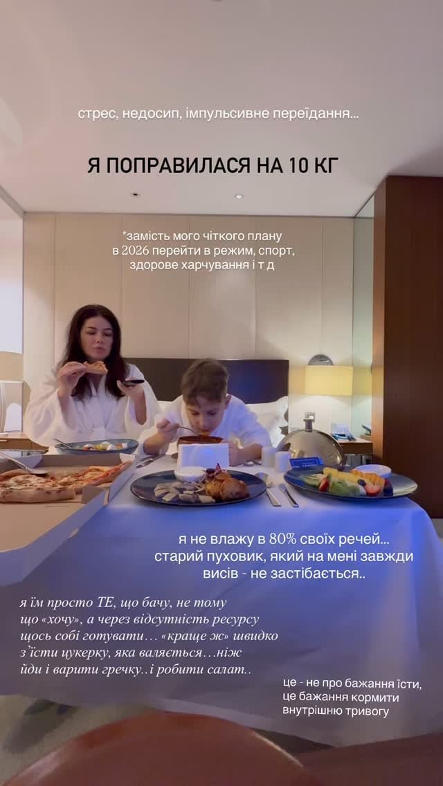 "Я поправилась на 10 кг. Я не влажу в 80% своїх речей…Я їм просто те, що бачу, не тому, що "хочу", а через відсутність ресурсу щось собі готувати… "Краще ж" швидко з'їсти цукерку, яка валяється, ніж йди і варити гречку і робити салат. Це не про бажання їсти – це бажання кормити внутрішню тривогу", - відверто поділилась блогерка.