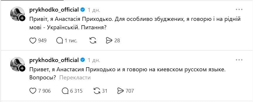 Згодом співачка відповіла на хвилю гейту новим дописом — уже українською мовою. Вона наголосила, що володіє рідною мовою і може нею спілкуватися: «Привіт, я Анастасія Приходько. Для особливо збуджених я говорю і рідною мовою — українською. Питання?».