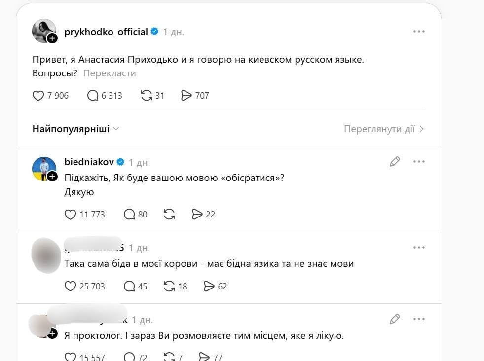 У публікації Приходько написала російською: «Привіт, я Анастасія Приходько і я розмовляю російською київською мовою. Є питання?». Така позиція не залишилася без відповіді, зокрема від ведучого Андрія Бєднякова, який різко відреагував на слова співачки.