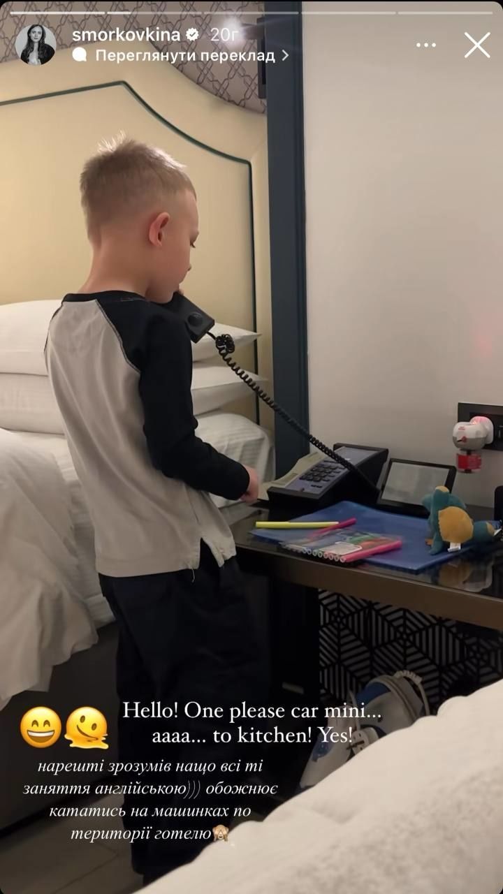 У своєму фотоблогу зірка показалася в готельному номері, де її син облаштував собі ліжечко просто на терасі. А також замилувала кадрами, як хлопець самостійно англійською мовою замовляв собі іграшкову машинку через дзвінок на рецепцію готелю.