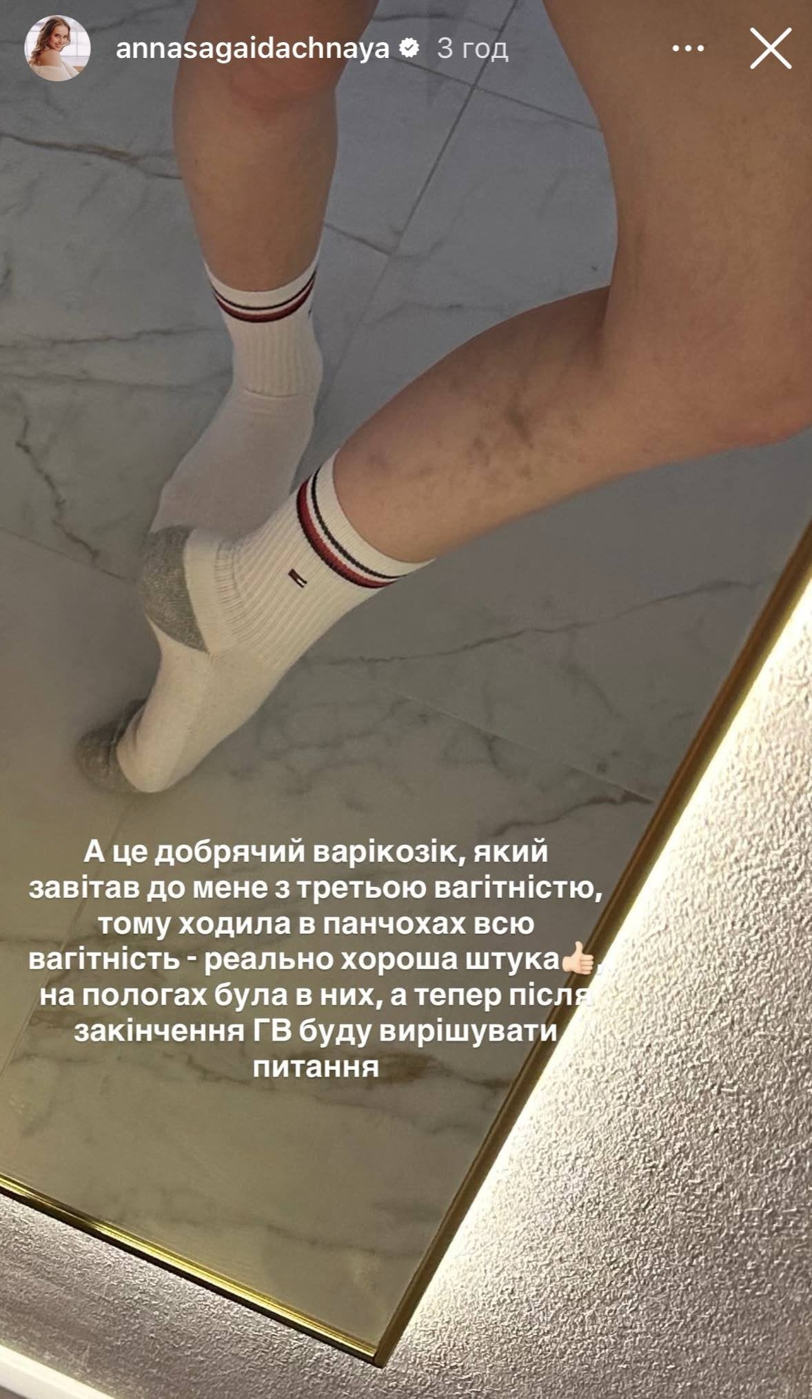 «А це добрячий варикоз, який завітав до мене з третьою вагітністю, тому ходила в панчохах всю вагітність — реально хороша штука. На пологах була в них, а тепер після закінчення грудного вигодовування буду вирішувати питання», — поділилася акторка.