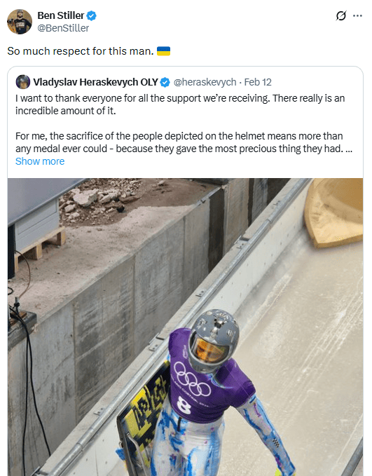 Владислава Гераскевича підтримав голлівудський актор Бен Стіллер. У своєму акаунті в соцмережі X він зробив репост допису скелетоніста, в якому той дякував за підтримку та зазначив, що для нього "жертва людей, зображених на шоломі, означає більше, ніж будь-яка медаль, бо вони віддали найцінніше, що мали".