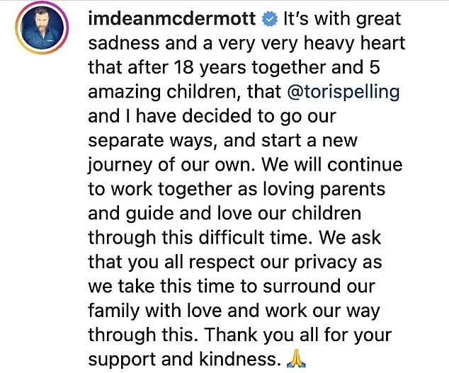 "З великим сумом і дуже-дуже важким серцем повідомляємо, що після 18 років спільного життя і, маючи 5 дивовижних дітей, я і Торі вирішили піти окремим шляхом і почати нову власну подорож", - написав МакДермотт.
