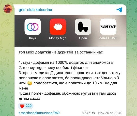 Скриншот допису Даші Кацуріної / © t.me/grlsclubkatsurina