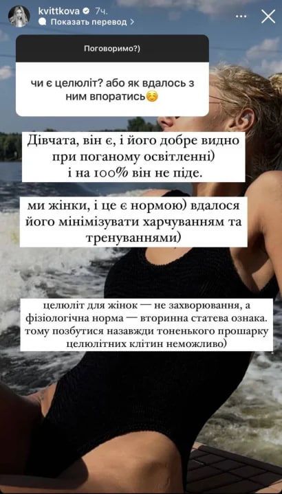 "Він (целюліт – прим. ред.) є і його добре видно при поганому освітленні. І на 100% він не піде. Ми – жінки, і це є нормою. Вдалося його мінімізувати харчуванням та тренуваннями. Целюліт для жінок – не захворювання, а фізіологічна норма – вторинна статева ознака. Тому позбутися назавжди тоненького прошарку целюлітних клітин неможливо", - пояснила блогерка.