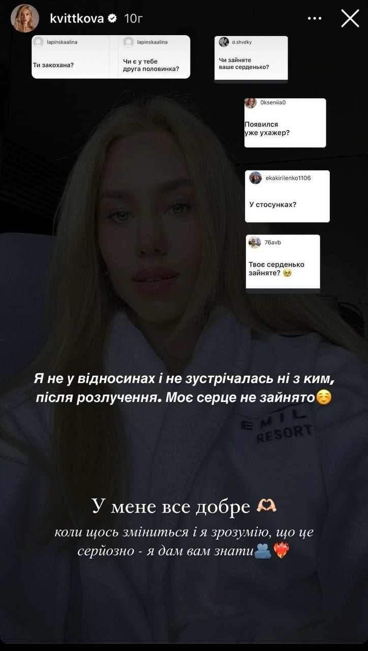 Після цього зливу Дашу Квіткову просто засипали запитаннями про особисте життя та просили прокоментувати, чи дійсно в неї з'явився обранець. Блогерка зазначила, що наразі самотня та після розлучення ні з ким не перебувала в стосунках. Знаменитість також додала, якщо в її особистому житті щось зміниться, то вона дасть про це знати.