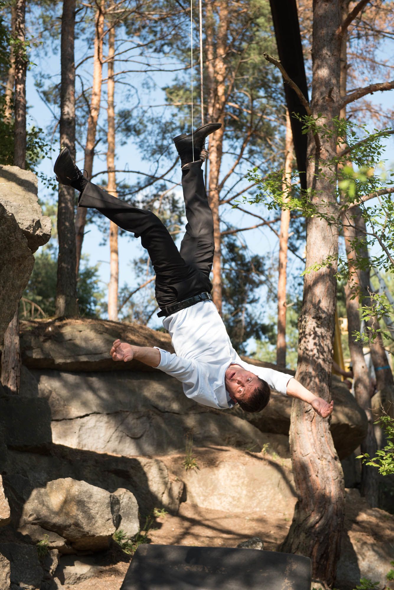 4) Заради однієї сцени Зеленському довелося дві години провести з заклеєним ротом, а ще висіти вниз головою на дереві і бігати лісом із камерою вагою 35 кг;