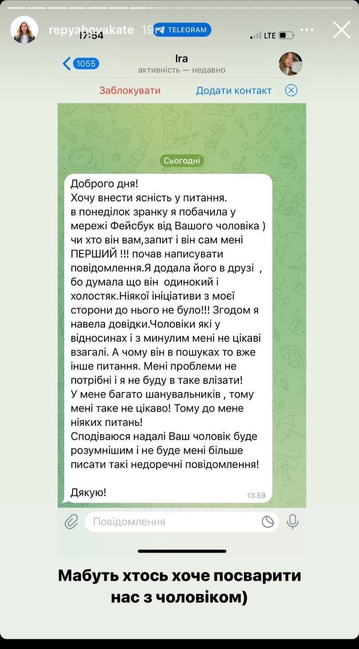 Реп'яхова була здивована таким повідомленням. Блогерка переконана, що хтось намагається їх із чоловіком розлучити: "Мабуть, хтось хоче посварити нас із чоловіком".