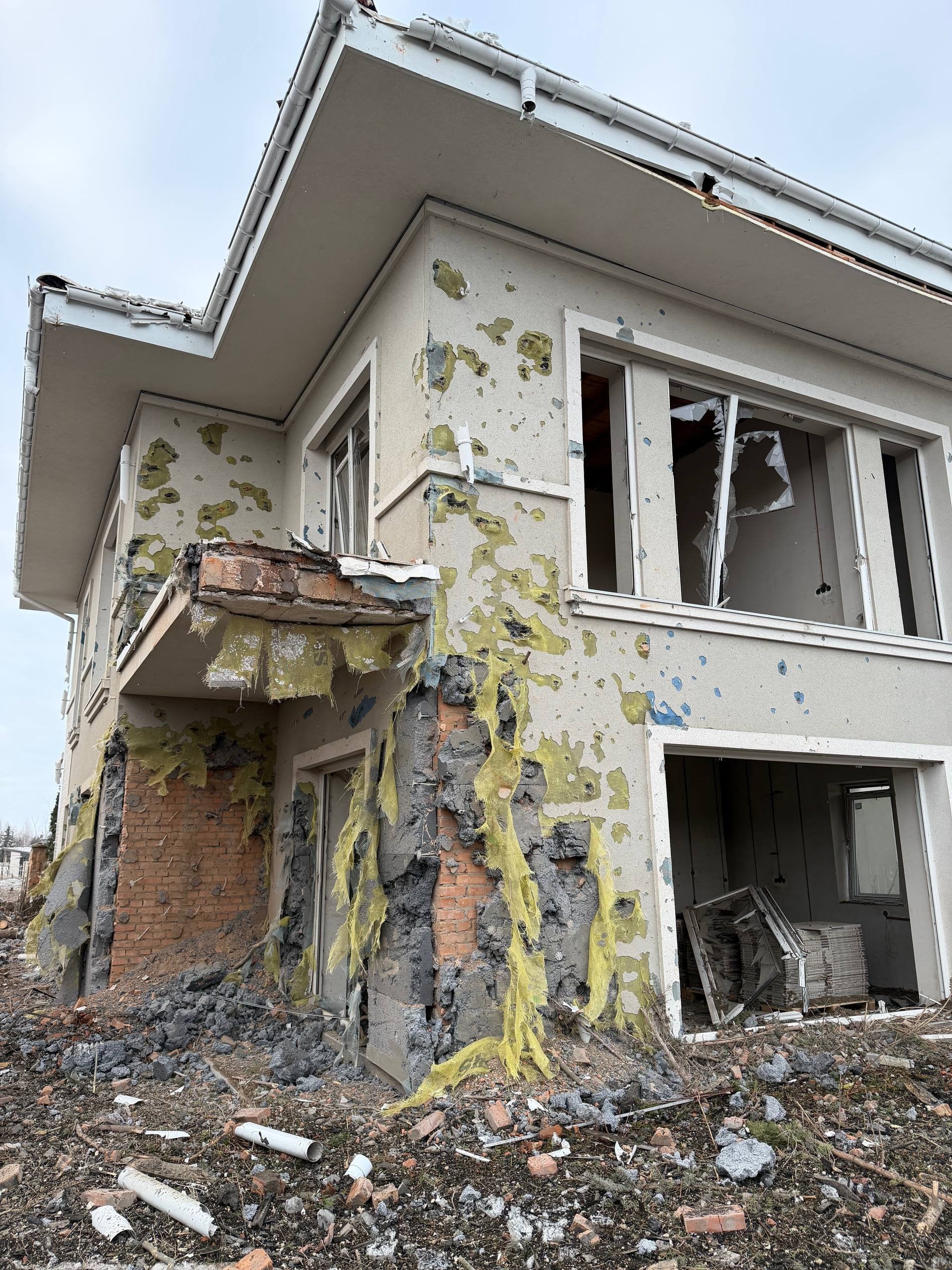 Ведучий разом із нинішньою дружиною, блогеркою Катериною Полтавською, поїхав до будинку, аби зафіксувати всі пошкодження. У своєму Telegram-каналі обраниця шоумена вже показала, який зараз вигляд має оселя. Зокрема, фасад будинку зазнав серйозних пошкоджень, місцями кусками посипалось оздоблення. Також зруйнована водостічна система. У будинку повилітали вікна. Окрім того, ворота теж знесло вибуховою хвилею. Наразі подвір'я всіяне уламками.