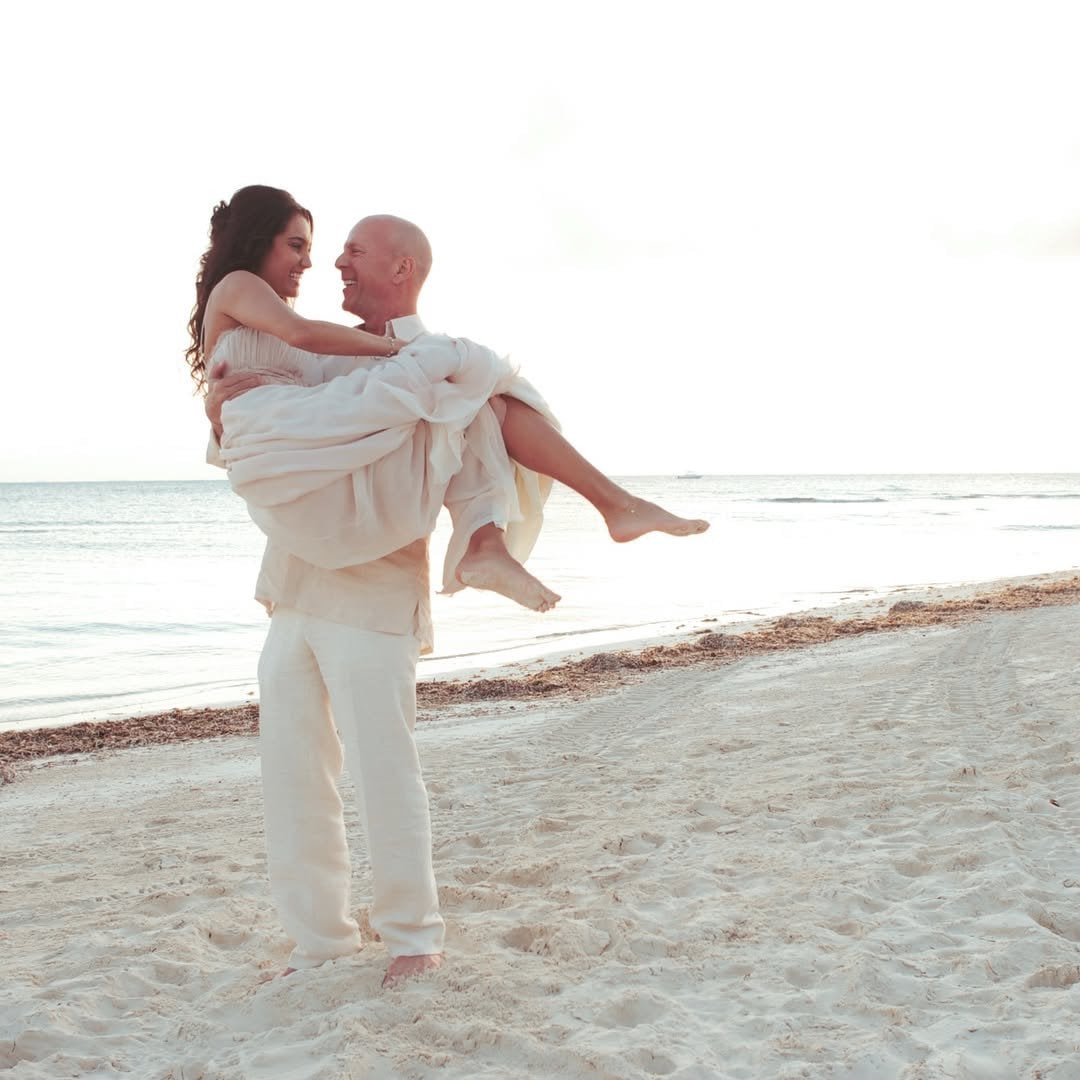Емма Гемінг опублікувала архівне романтичне фото з Брюсом Віллісом. Знімок був зроблений на березі Карибського моря. Подружжя позувало у білому вбранні. Брюс Вілліс тримав дружину на руках, а та ніжно обіймала його.