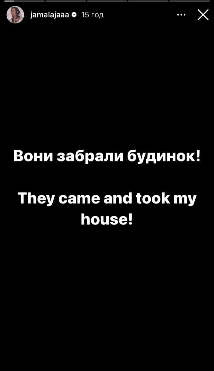 "Вони забрали будинок! Якщо у світі є справедливість – Росія за все відповість! За всі наші сльози, за наших рідних і знайомих, за наші будинки, за нашу землю. Усе, що в мене є, – моє дитинство, мої спогади, які намагаюся берегти. І сьогодні ці спогади забирають. Копаються в батьківських речах, у родинних архівах. Уже стільки поколінь ми не можемо залишити нічого своїм дітям. Бо злочинці знову приходять у наш дім. Знищують, руйнують, відбирають, крадуть. Просто в цю мить вони забирають те, чим жили мої батьки. Над чим так важко працювали і власними руками, кров'ю і потом будували. Вони забрали навіть не в мене. А в моїх батьків. Усе, що я можу зробити сьогодні, – не мовчати. І не мовчатиму!", – наголосила Джамала.
