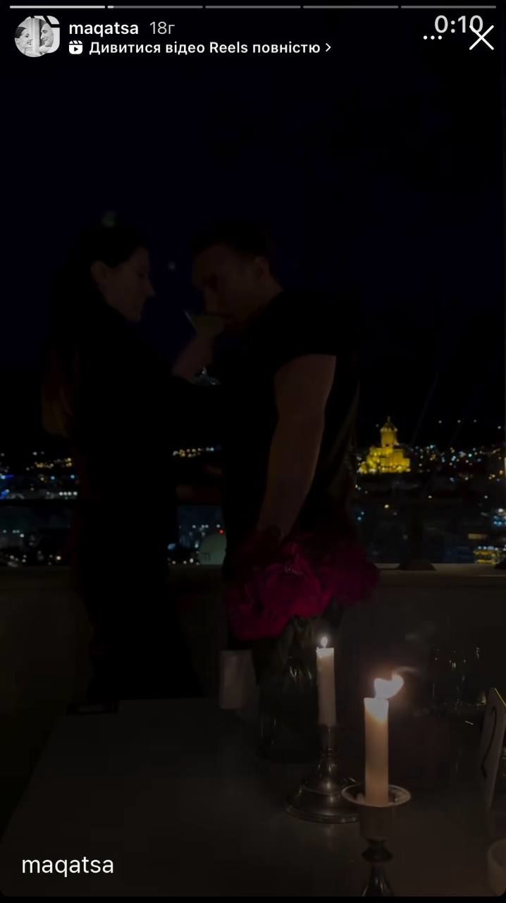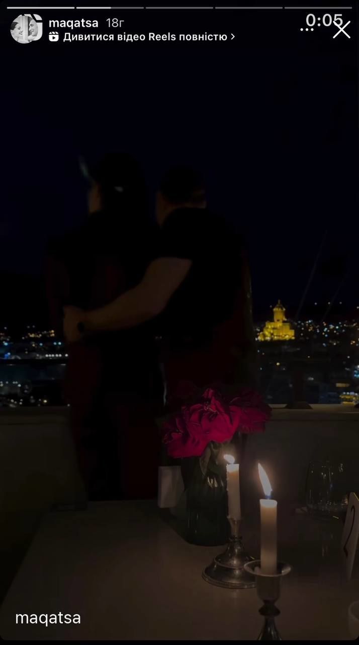 Подружжя поїхало до закладу, коли вже стемніло. Закохані обіймалися та милувалися вечірнім краєвидом на Тбілісі. Романтичну атмосферу доповнювали запалені свічки, що стояли на столику, та червоні троянди.