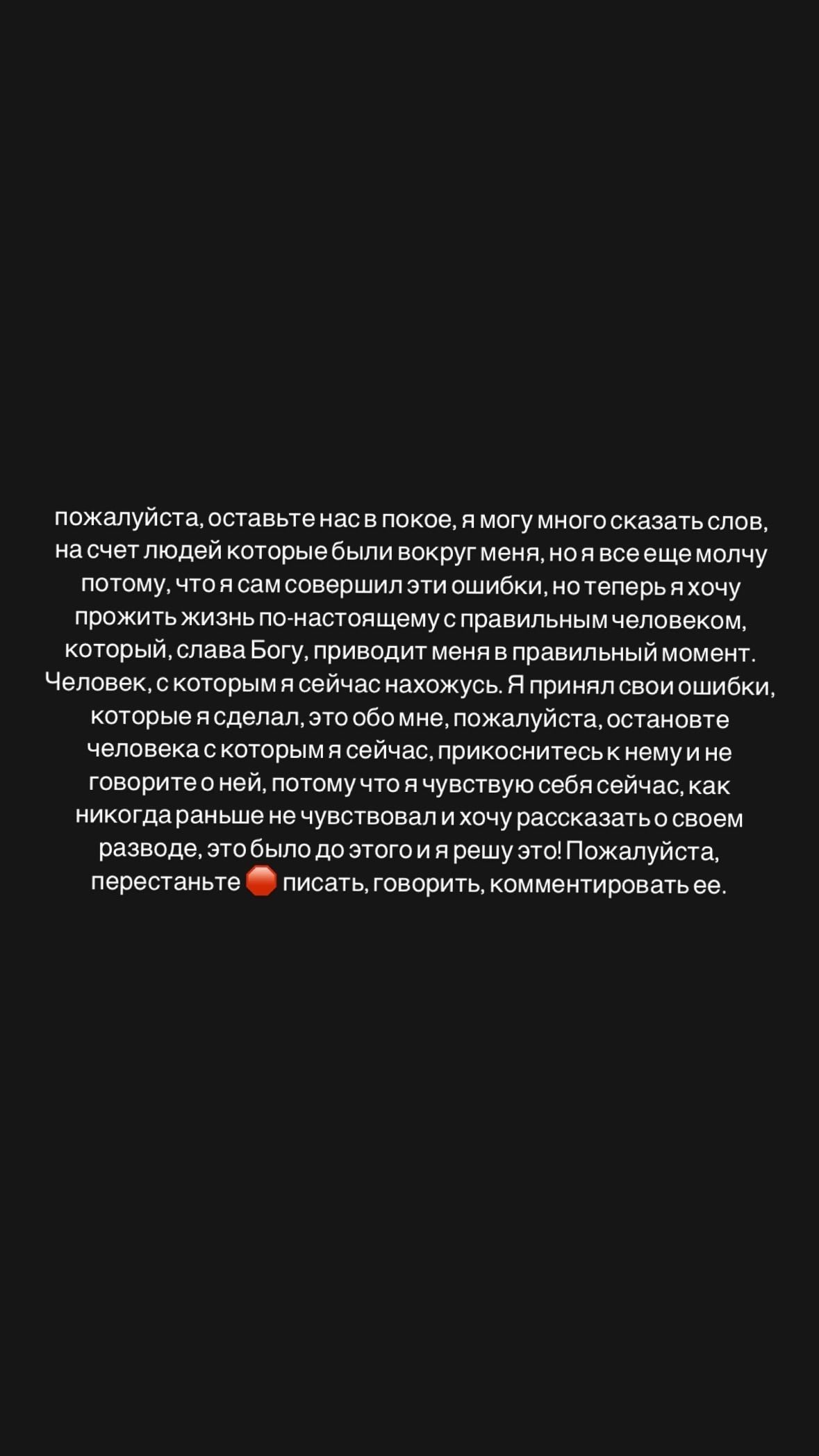 "Залиште нас у спокої. Я міг би багато чого сказати стосовно людей, які були навколо мене. Але я все ще мовчу, тому що я сам зробив ці помилки. Але тепер я хочу прожити життя по-справжньому з правильною людиною, яка, хвала Богу, приводить мене у правильний момент", - написав Мурат.
