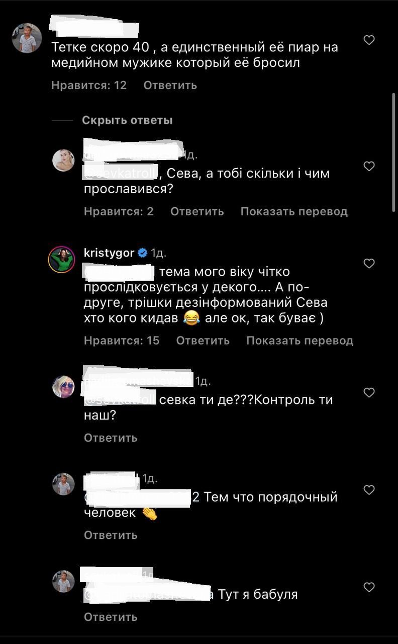 "Тема мого віку чітко прослідковується у декого…А по-друге, трошки дезінформативний Сева, хто кого кидав. Але ок, так буває", - прокоментувала Христина.