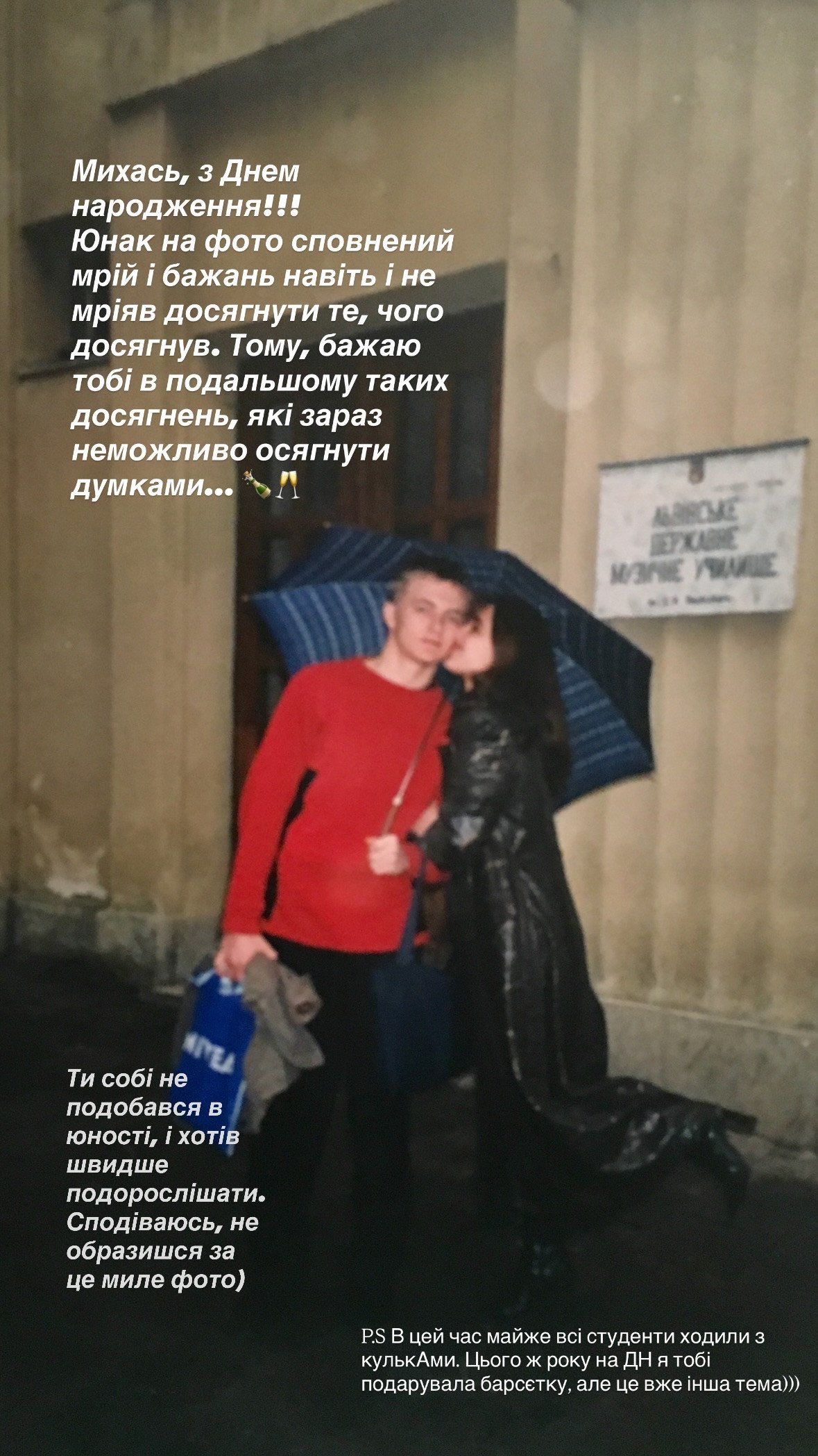 "Михась, з днем народження! Юнак на фото, сповнений мрій і бажань, навіть і не мріяв досягнути те, чого досягнув. Тому, бажаю тобі в подальшому таких досягнень, які зараз неможливо осягнути думками", - звернулась до співака його колишня дружина.