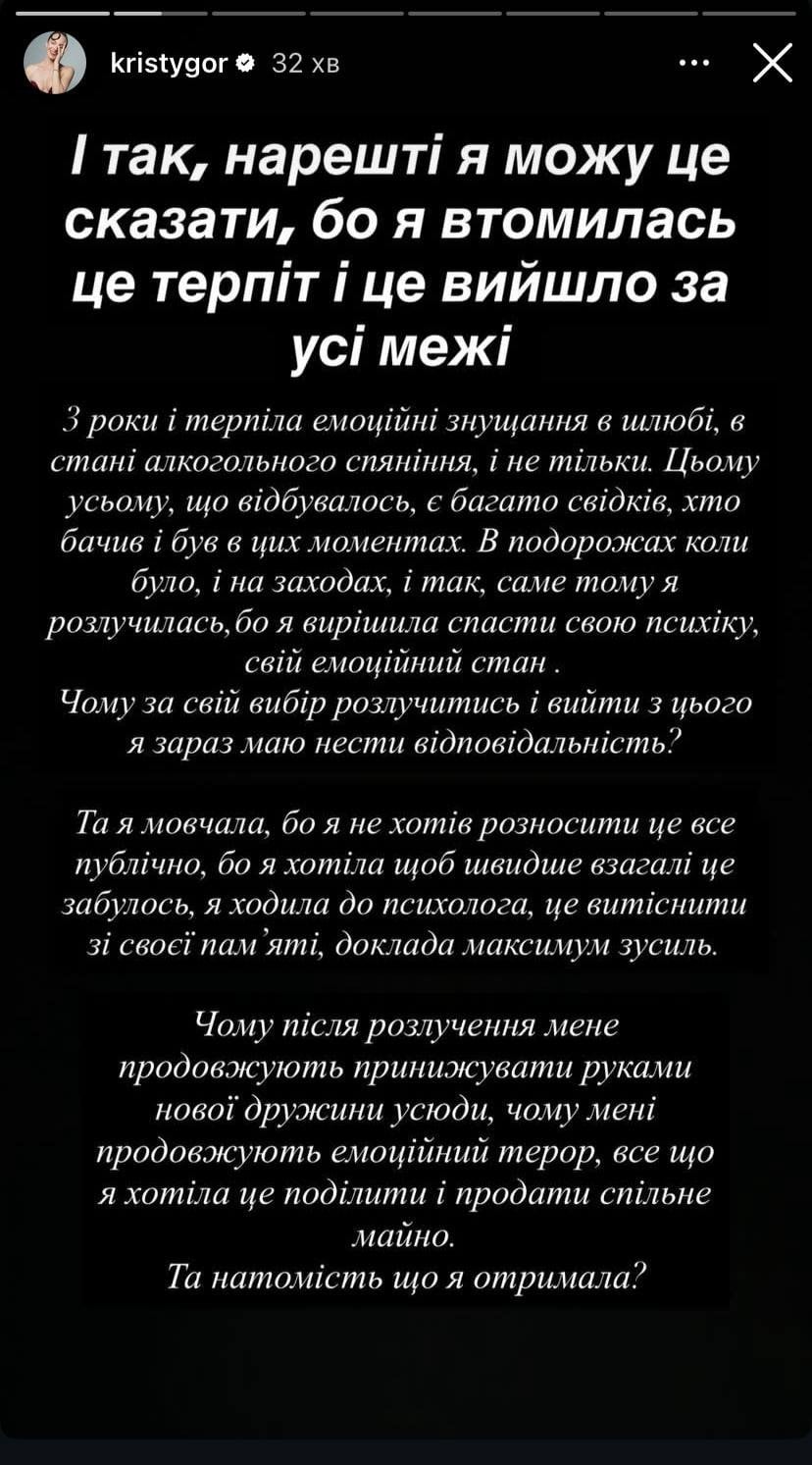 "Три роки я терпіла емоційні знущання в шлюбі, в стані алкогольного сп'яніння, і не тільки. Саме тому я розлучилась, бо я вирішила спасти свою психіку, свій емоційний стан. Чому за свій вибір розлучитись і вийти з цього я зараз маю нести відповідальність? Так, я сама винна, що я вірила, що це перестане продовжуватись, але це не перестало, а погіршилось, тому було прийняте мною рішення розлучитись", - видала Христина.