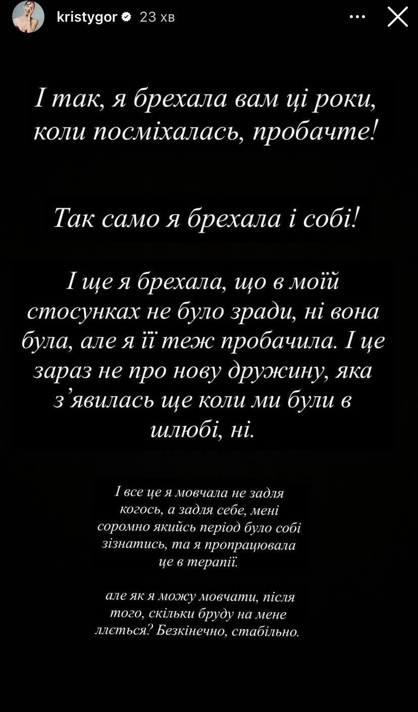"Я брехала, що в моїх стосунках не було зради, ні, вона була, але я її теж пробачила. І це зараз не про нову дружину, яка з'явилась, ще коли ми були в шлюбі, ні. Я мовчала не задля когось, а задля себе, мені соромно якийсь період було собі зізнатись", - видала Христина.