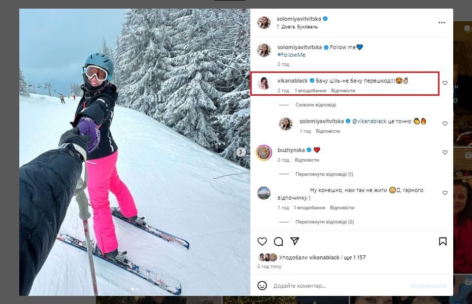 Однак Смеюха нарешті вийшла на зв'язок. Щоправда, не на своєму акаунті. Виконавиця відреагувала на допис ведучої Соломії Вітвіцької, де та показувала свій відпочинок у Карпатах. Співачка поставила вподобання, а також залишила коментар: "Бачу ціль - не бачу перешкод".