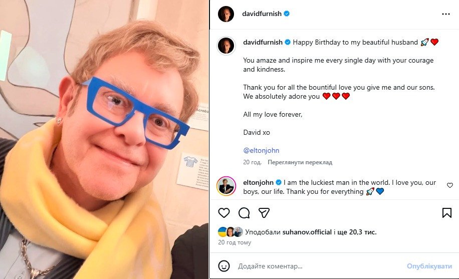 У відповідь Елтон Джон не стримав емоцій і у коментарях зізнався, що почувається абсолютно щасливим: «Я найщасливіша людина у світі. Я люблю тебе, наших хлопців, наше життя. Дякую за все».