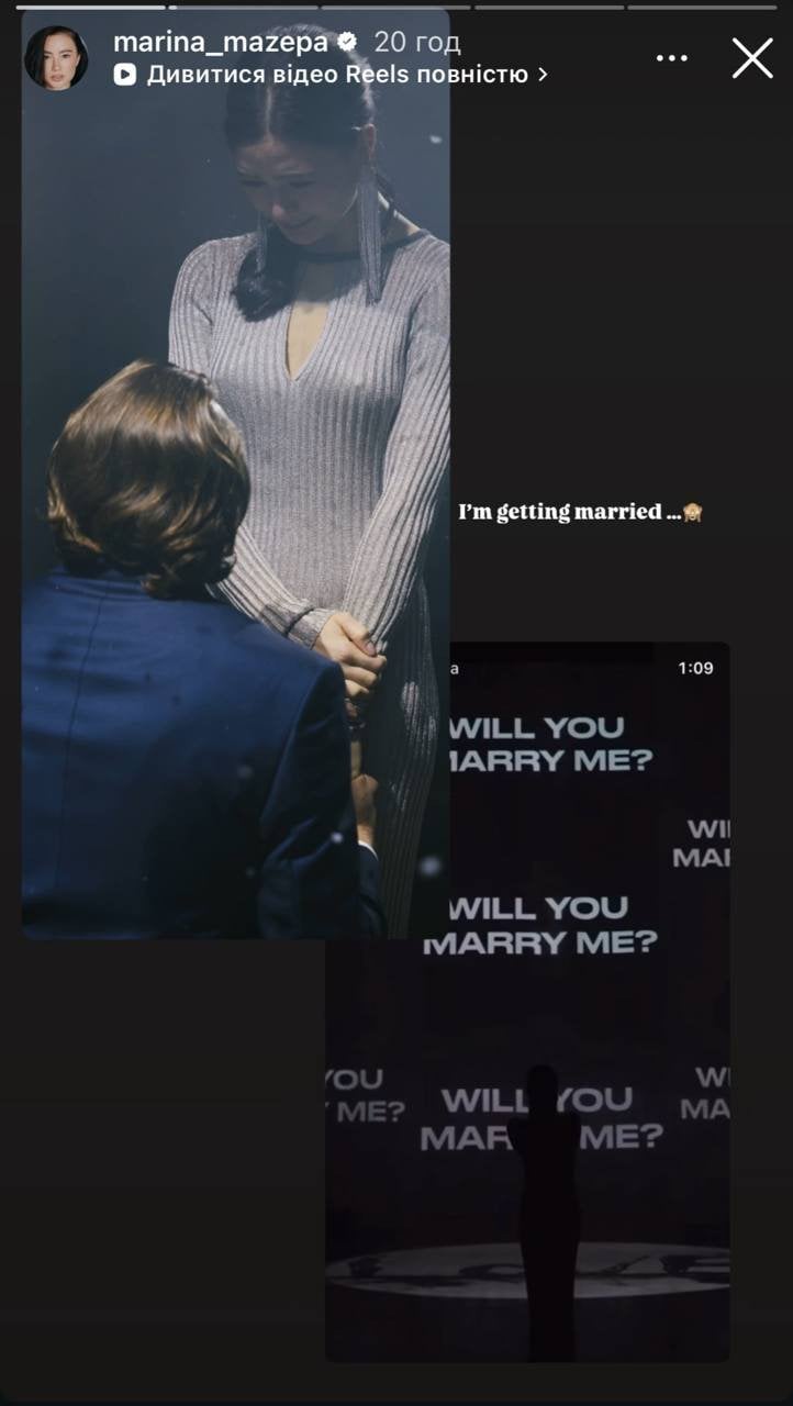 Під час зворушливої промови іноземець пообіцяв коханій бути поруч у будь-яких обставинах, підтримувати і щодня обирати її. Наприкінці проєкції з’явилося запитання: «Чи вийдеш за мене заміж?». Марина відповіла згодою, і пара обмінялася міцними обіймами та солодкими поцілунками. Крім того, акторка показала свою коштовну каблучку.