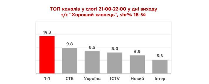 Так, за аудиторією 18-54, вся Україна середній рейтинг основного показу склав 5.2%, середня частка ― 14.4%. Таким, чином, 20-серійна драма "Хороший хлопець" очолила ТОП прем'єрних серіалів 2017 року.