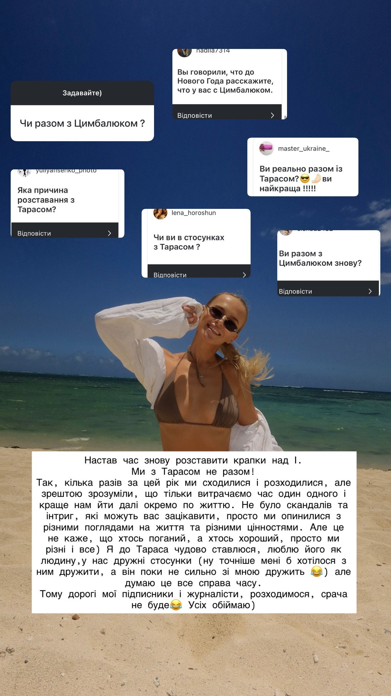 Подейкували, що пара нібито перебуває в стосунках, навіть попри участь артиста в романтичному шоу "Холостяк". Світлана Готочкіна вирішила в Instagram-stories розставити всі крапки над "і". Вона чесно зізналась, що вони дійсно не в стосунках. Хоч раніше пара й намагалась давати одне одному шанс. Проте Готочкіна та Цимбалюк вирішили, що їм краще рухатися далі окремо, оскільки в них різні цінності та погляди на життя. При цьому, за словами бізнесвумен, вони розійшлися без скандалів та образ.