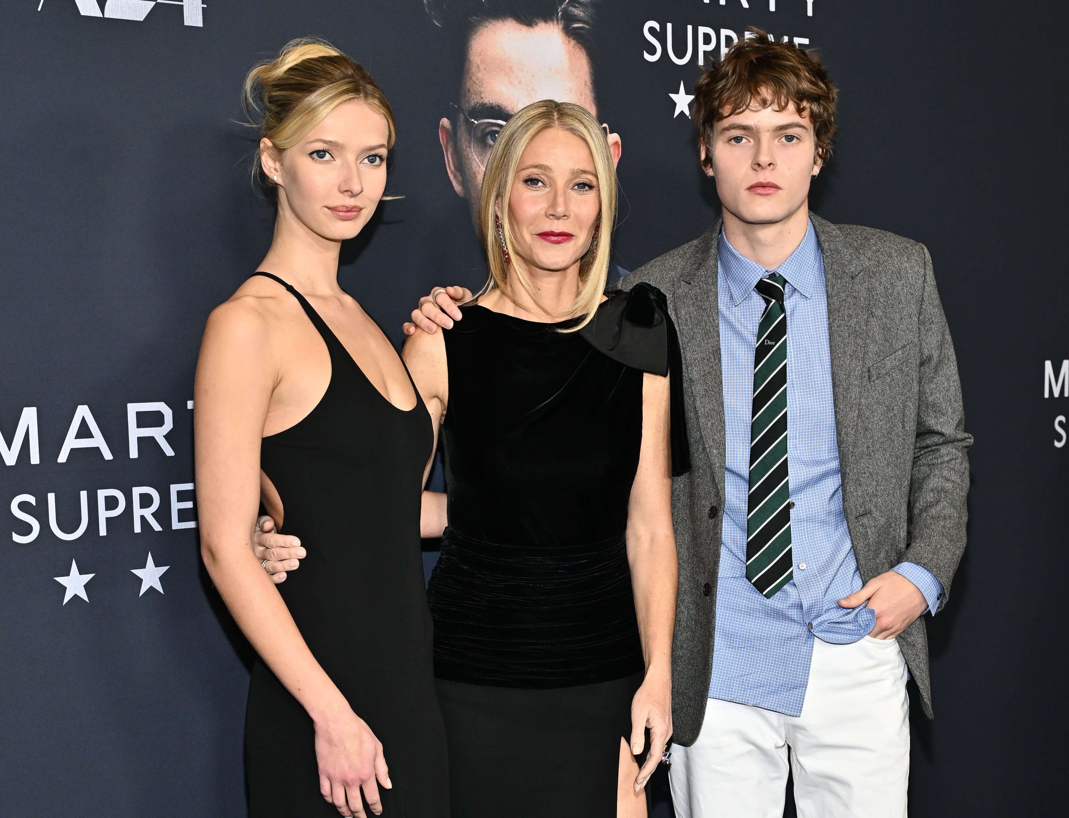 Артистка позувала перед об'єктивами фотокамер в чорній оксамитовій довгій сукні з бантом на плечі. 19-річний Мозем для події обрав білі штани, блакитну сорочку та сірий піджат. Особливої уваги заслуговує 21-річна Еппл, яка одягнула мамину сукню, в якій Пелтроу 30 років тому сяяла на прем'єрі фільму "Емма".